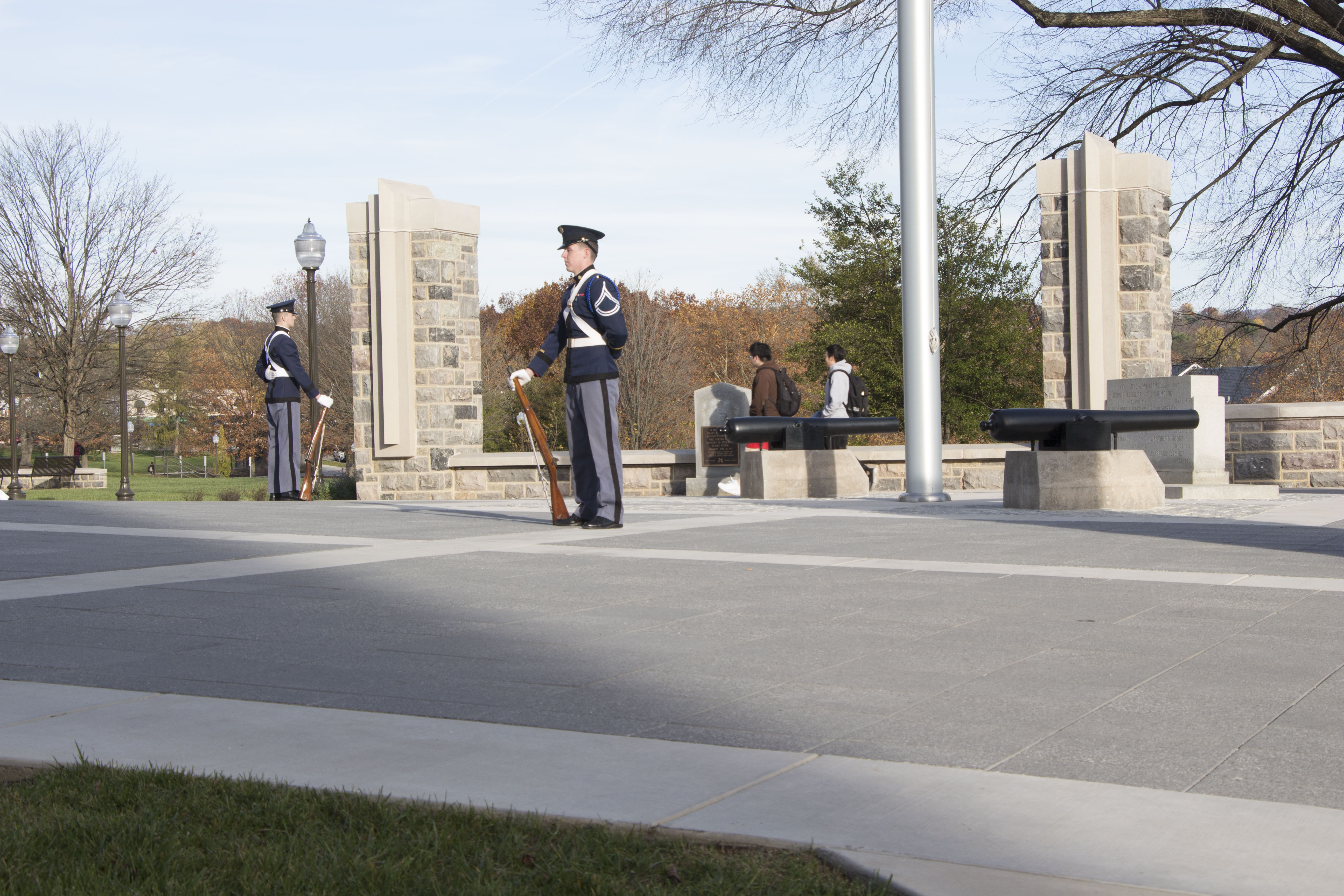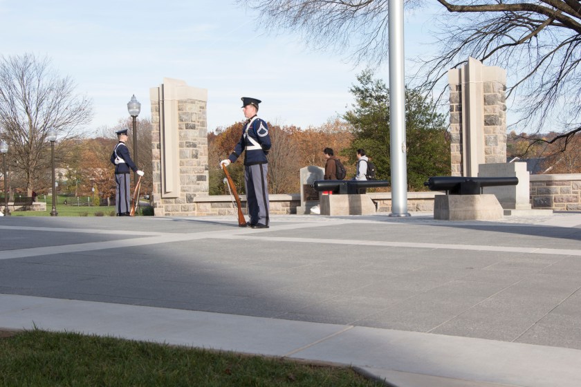 Previous Image Next Image 1_1 Blacksburg, Va., Nov. 10- The Rock Memorial— Two cadets stand around the perimeter of The Rock. No one is to walk inside the diamond shape in honor of the fallen Hokies. Photo: Alexis Johnson.