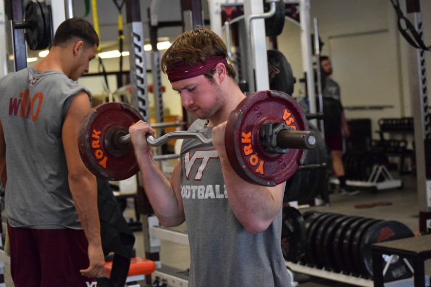 Previous Image Next Image lifting2 Blacksburg, Va., Sept. 6- LIFTING: C.J. Carroll engages in off-season weight lifting sessions. Photo: Blayne Fink