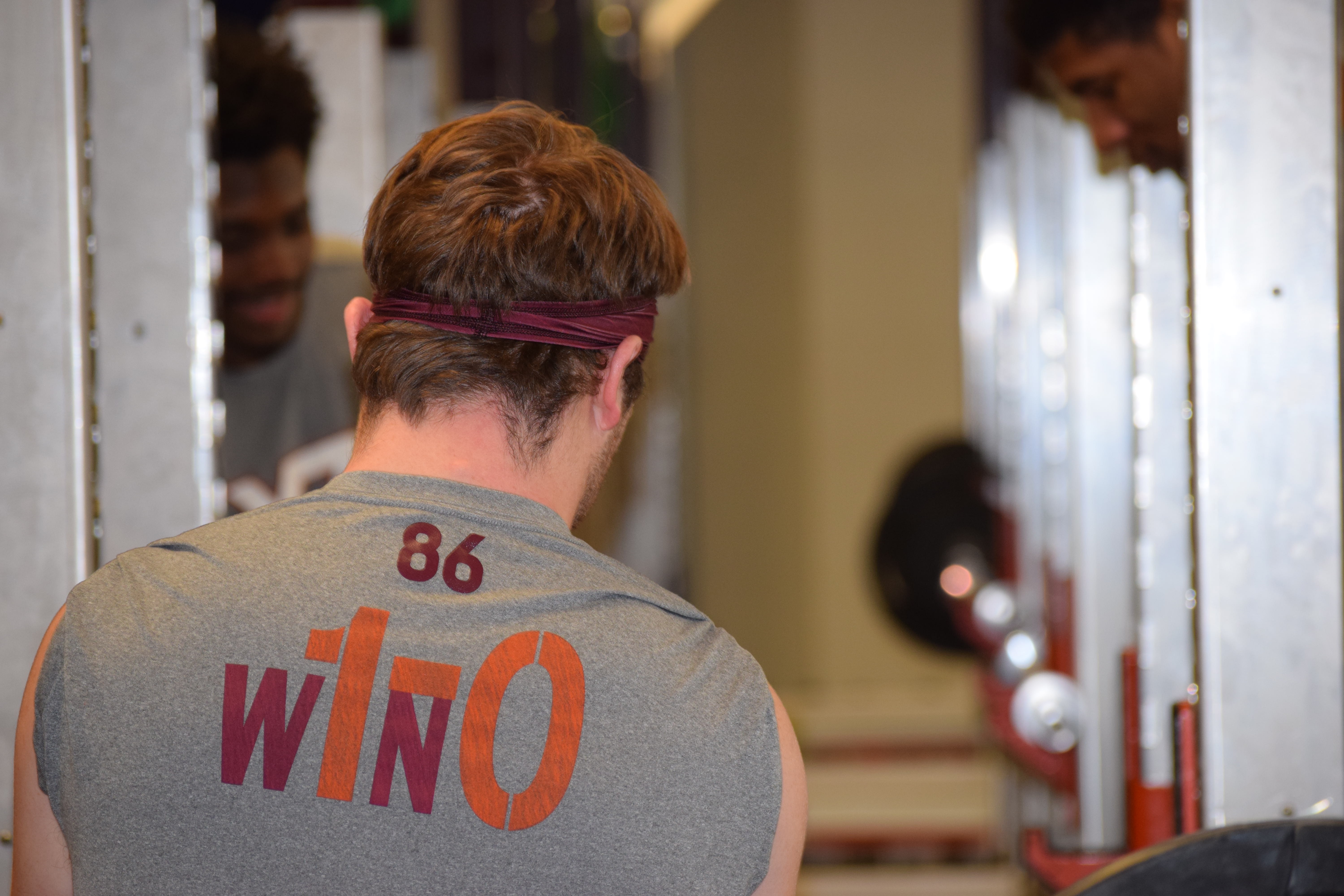 Previous Image win2 Blacksburg, Va., Feb. 6- GEAR: Preferred walk-on players are given the same gear as that of scholarship players, such as the w1n-0 training tops Carroll sports here. Photo: Blayne Fink