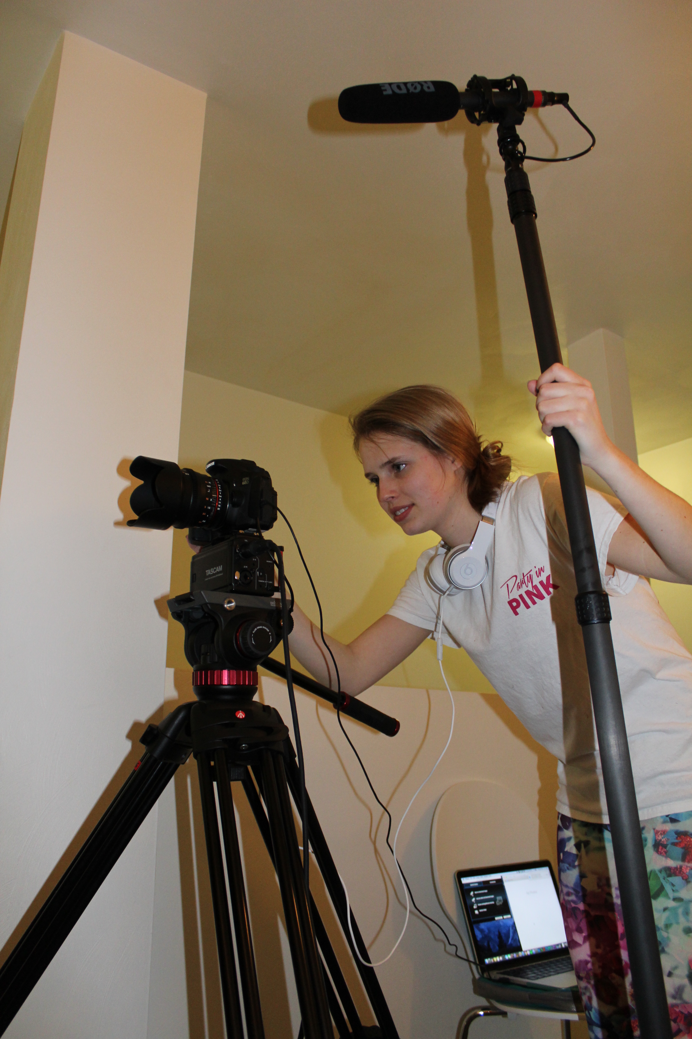 Blacksburg, Va., Feb. 23 – The Set-Up: Sophomore Madison Hummel checks sound and sets up a shot before filming for her movie, “Social Media(nxiety).” “Crafting stories through art is a wonderful tool to make audiences laugh or move them to make changes in our world,” Hummel said. Photo: Caitlyn Murray.