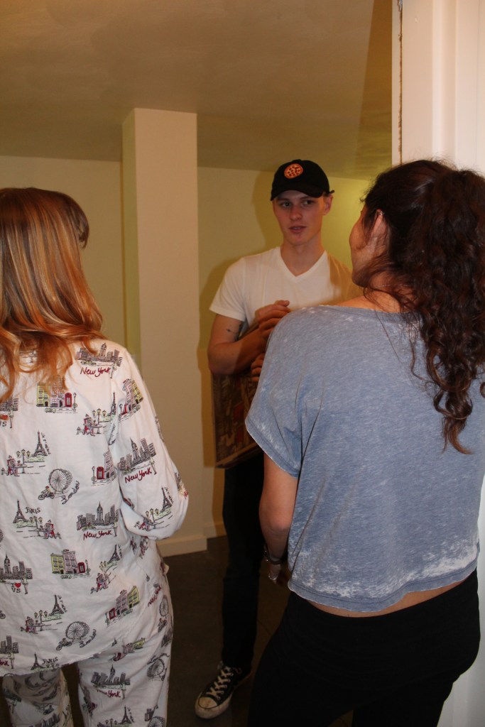 Blacksburg, Va., Feb. 23 – Action: Actors Untiedt (left), Danny Purcell (center), and Mavromatis (right) film a scene where the dreamy pizza delivery boy intrudes on a girl’s night. Each actor is in at least two other films this semester. Photo: Caitlyn Murray
