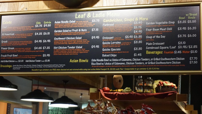 Previous Image Next Image dsc06872 Blacksburg, Va., Feb. 25 – Dining Hall Menus: West End Market’s Leaf and Ladle menu represents what a general menu in a Virginia Tech dining hall looks like. Menu items and prices are listed but calories are not.
