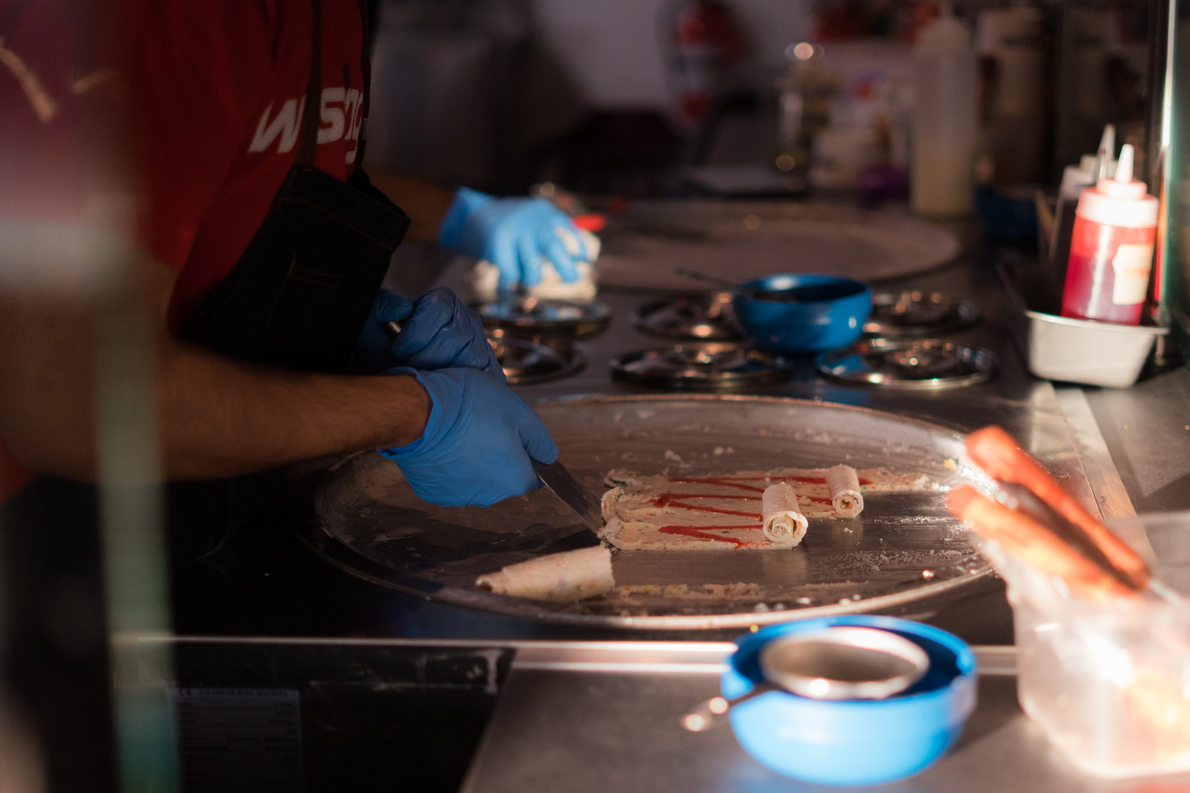 Previous Image Next Image DSC09351 Blacksburg, Va., Feb. 26 – ROLL THEM UP: A worker finishes the rolled ice cream process. Using metal spatulas, the ice cream is scrapped off vertically to form a rolled look. Photo: Ricky Lam.