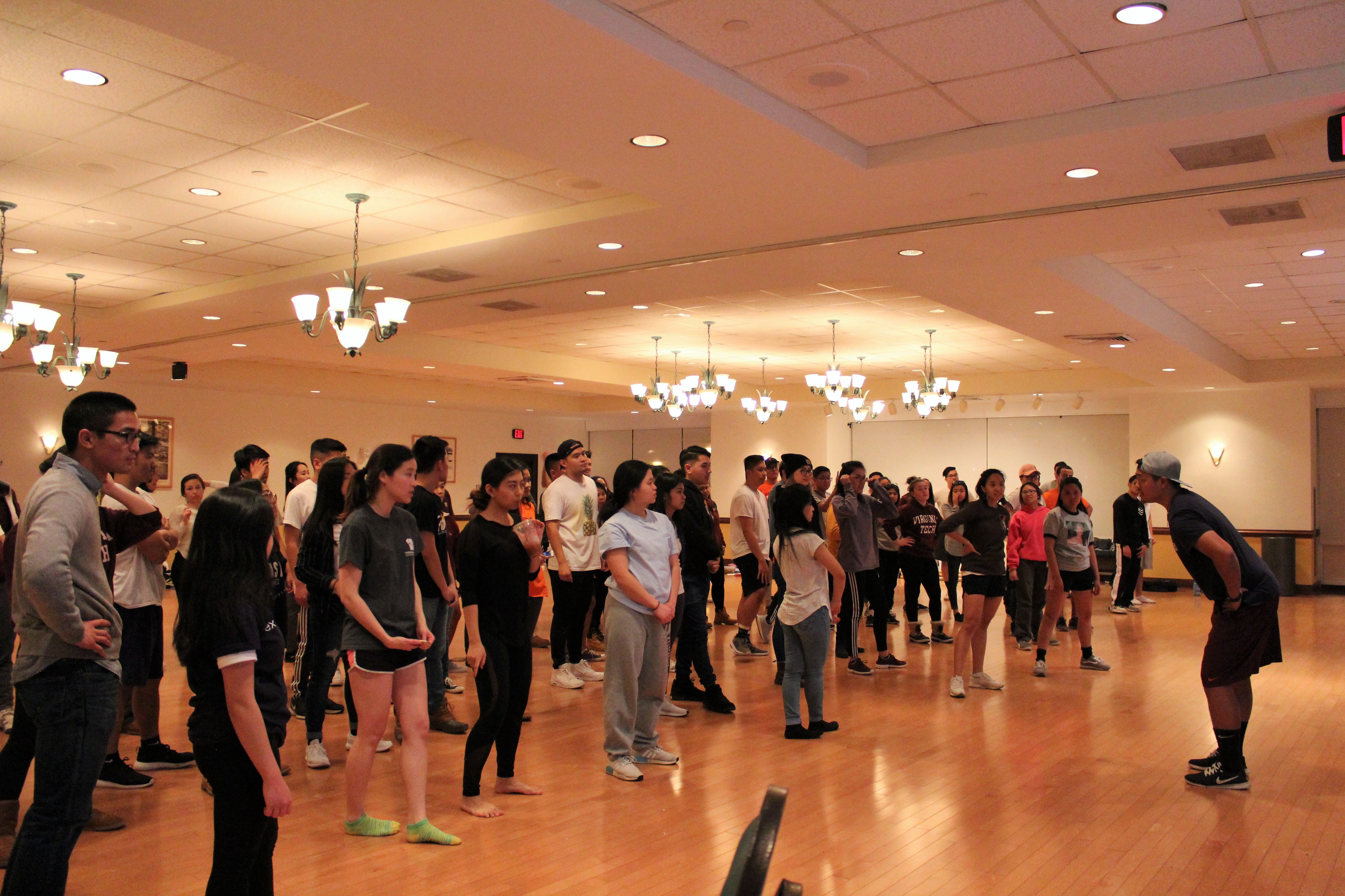 Previous Image Next Image IMG_3036 BLACKSBURG, Va., March 14 – Final Prep: AJ Campanilla teaches the curtain call dance at the final rehearsal, which lasted five hours. Photo: Kat Schneider