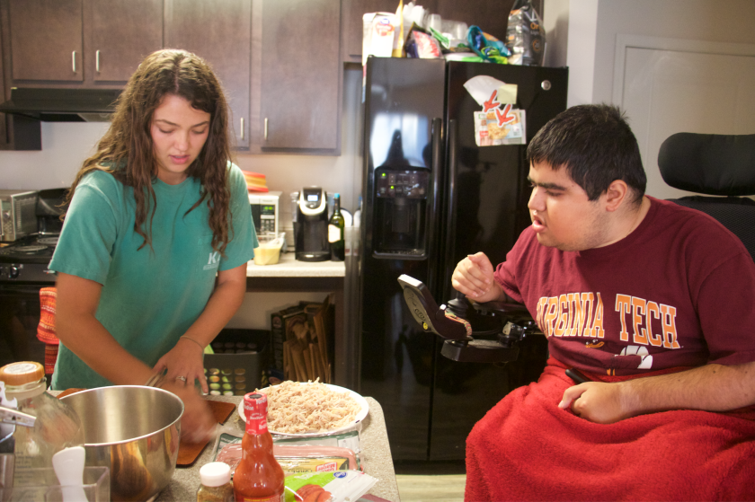 Previous Image Next Image Screen Shot 2018-10-03 at 9.10.04 AM Blacksburg Va., Oct 2 – BON APPETIT: Personal attendant, Alexa Rose, serves up dinner for Lefkowitz. She is making his favorite appetizer, buffalo chicken dip.