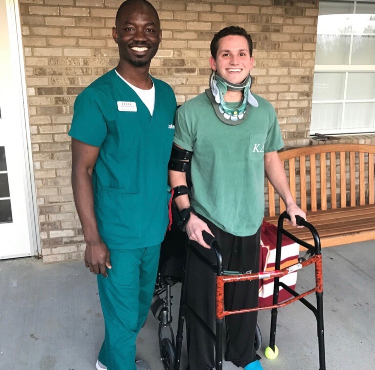Previous Image Next Image FullSizeRender copy 2 Blacksburg, Va., March 2017 – Recovery: Elmer stands with one of the physical therapists that helped him regain his ability to walk. Photo courtesy of Chris Elmer.