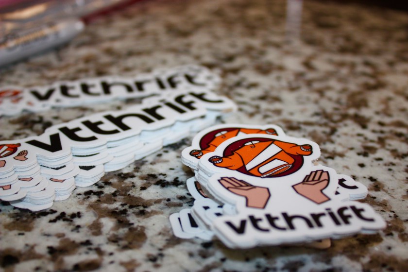 Previous Image Next Image IMG_1407 Blacksburg, Va. February 18 – Stickers: They hand out free VT Thrift stickers for laptops and phones as a way of marketing themselves on campus. Photo: Maria Berkowitz