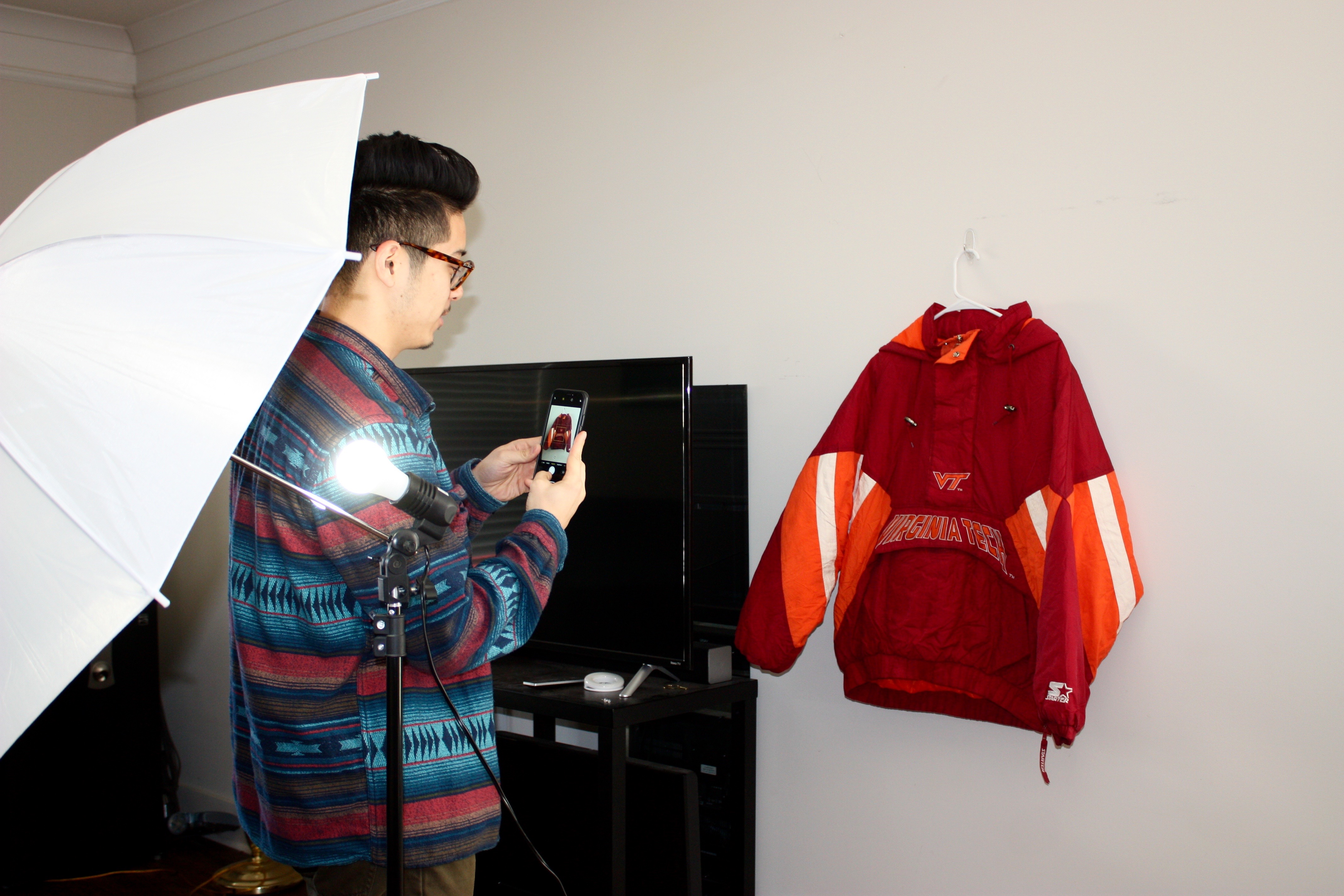Blacksburg, Va. February 18 – Instagram Aesthetic: Tan takes a picture of a Virginia Tech windbreaker to put up on the Instagram page. He says he takes the pictures the same way with the same lighting every time to make sure the page looks clean. Photo: Maria Berkowitz