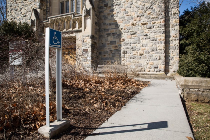 Previous Image Next Image LJS_6454 Blacksburg, Va., Feb. 18 — ROBESON RAMP: This handicap ramp leads into Robeson Hall. A tall and visible sign directs the way. Photo: Loren Skinker.