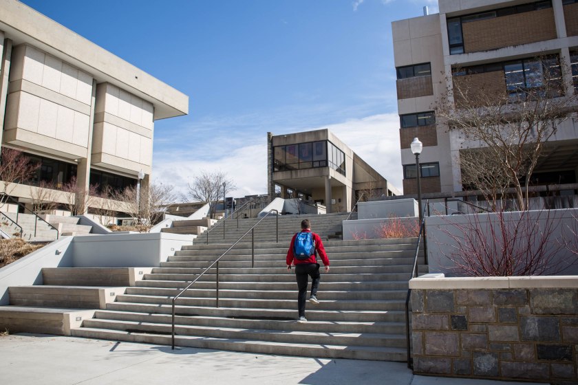 Blacksburg, Va., Feb. 18 — BURCHARD PLAZA STAIRS: The grade change from New Classroom Building to Burchard Plaza is over 100 feet. This steepness creates problems for Virginia Tech design teams to make handicap accessible routes. Photo: Loren Skinker.