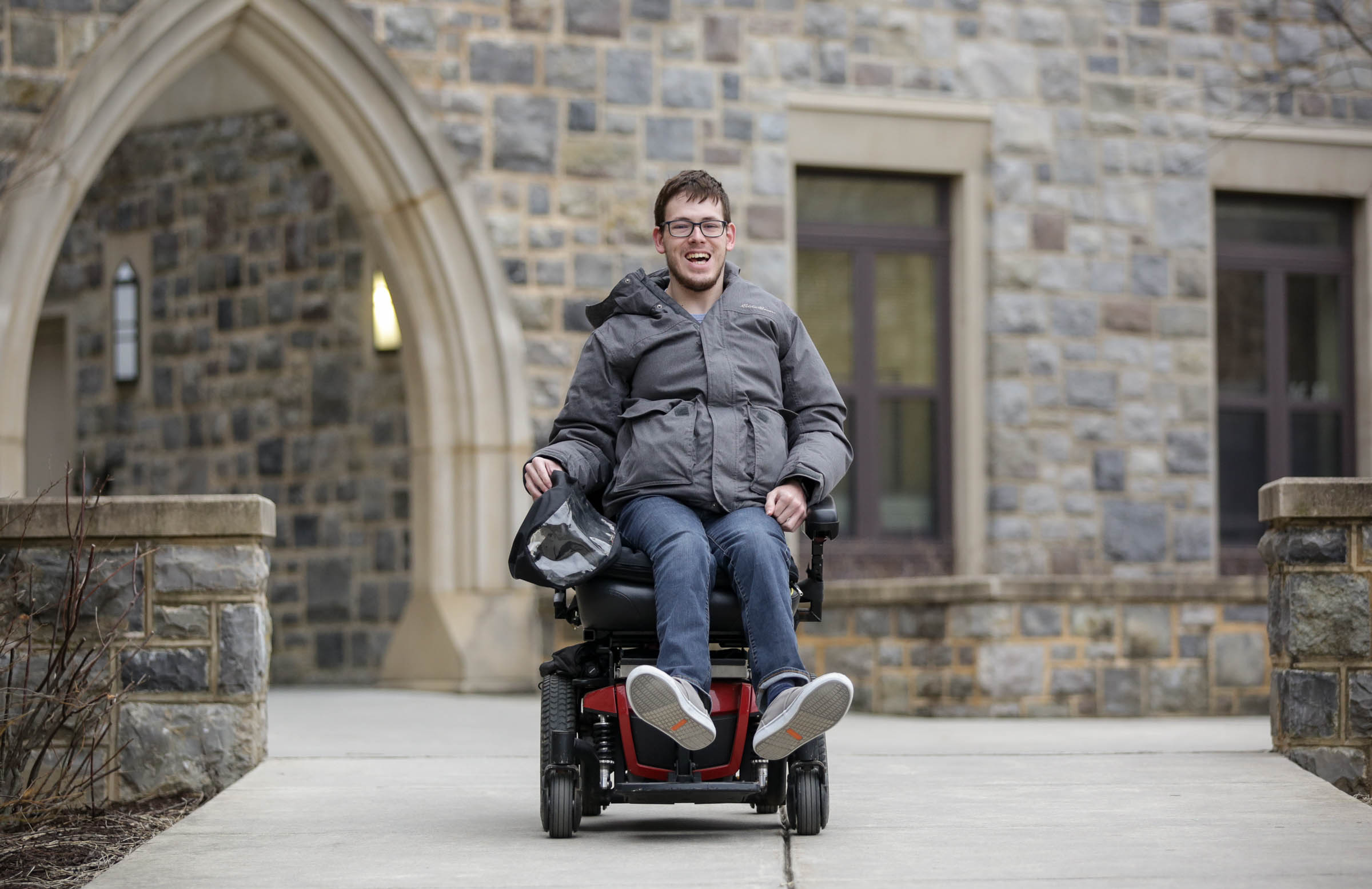 Previous Image LJS_7162 Blacksburg, Va., Feb. 19 — CRUISING TO CLASS: Trent Neely, a senior studying cinema, makes his way to class on his electric wheelchair. Photo: Loren Skinker.