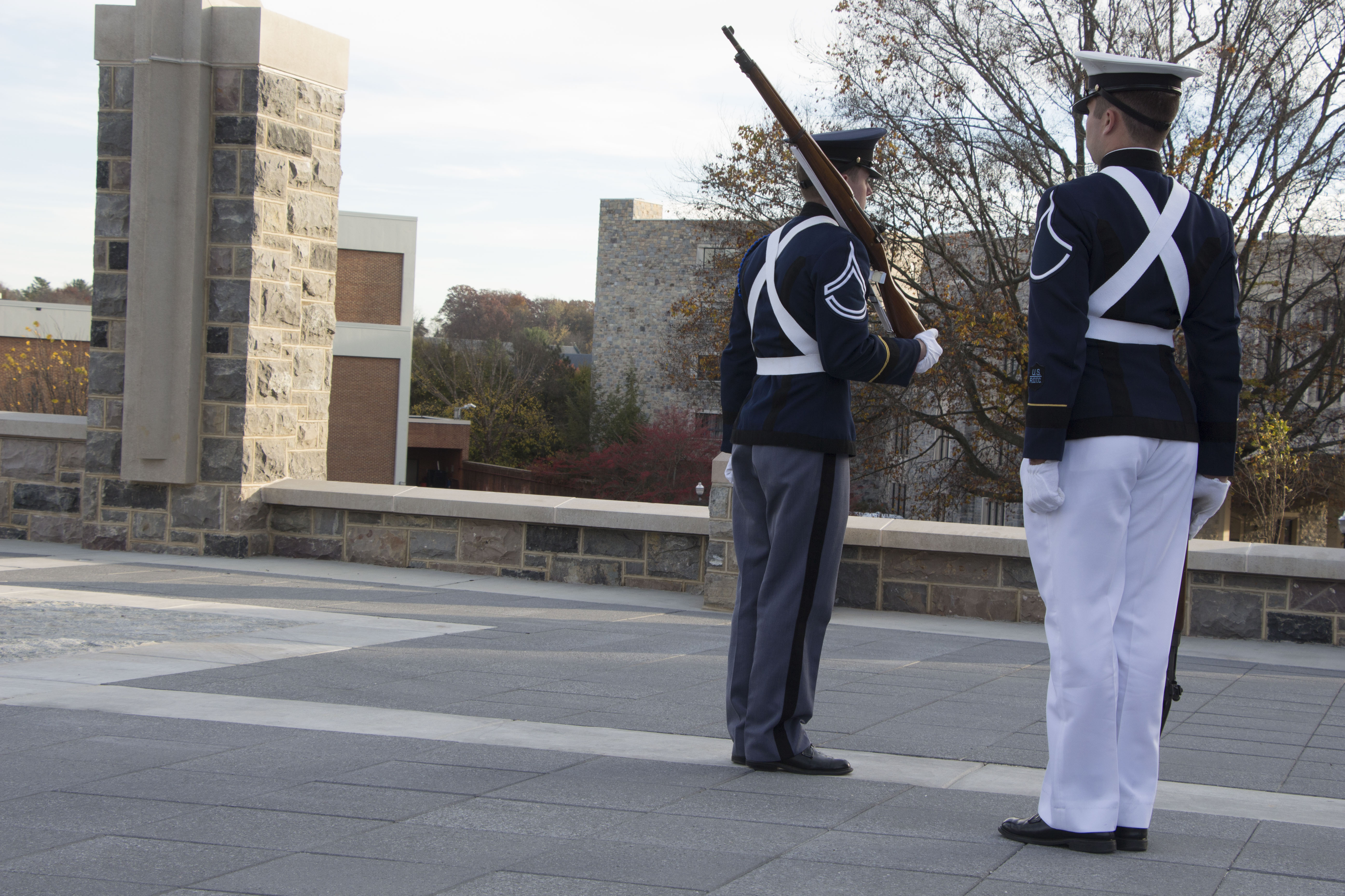 Previous Image Next Image 9 Blacksburg, Va., Nov. 10- The Rock Memorial— Two cadets change positions as one cadet completes his time guarding the rock while the other prepares to stand guard. Photo: Alexis Johnson.
