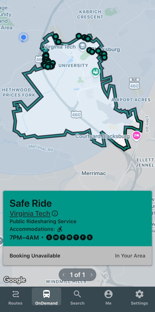 Virginia Tech’s nighttime safety escort, “Safe Ride,” starts in the evening and runs well into the night. Through a request on the TransLoc Rider app, they will provide walking escorts as well as car pickup by trained student drivers. Safe Ride is there to help students, faculty and staff, visitors of the university and Blacksburg locals get to their next destination around the Virginia Tech campus safely. With the usual form of transportation being a van, there are times when the van is not in operation. In this case, a member of the Virginia Tech Police Department will drive a police car to your location or give a walking escort if requested.