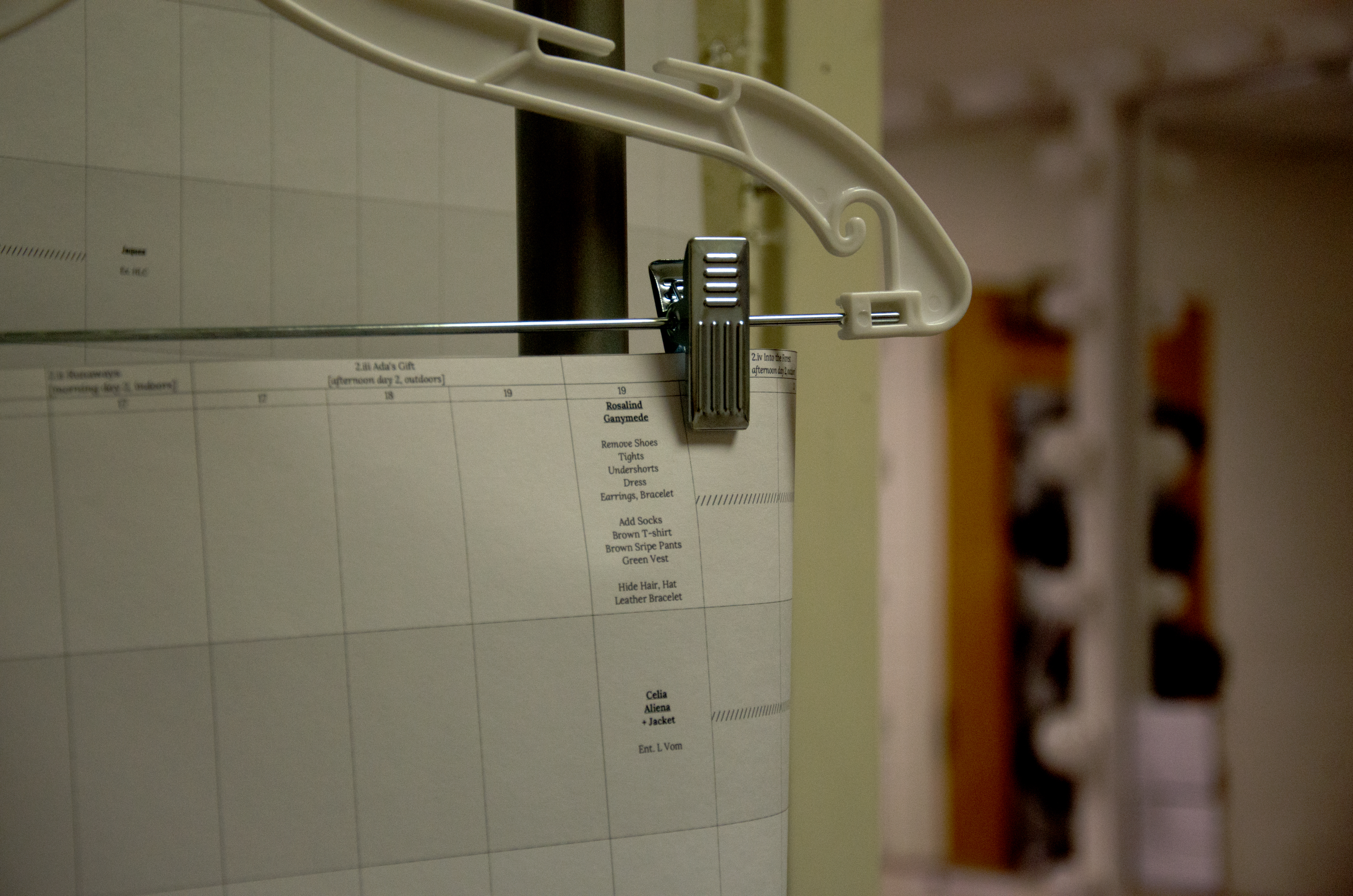 Previous Image Next Image costuming Blacksburg, Va., April 19 – Costume Changes: A schedule hangs outside the dressing rooms for reference by the costuming department. It outlines each costume change, its time and the clothing to change. Photo: Lizzy Street