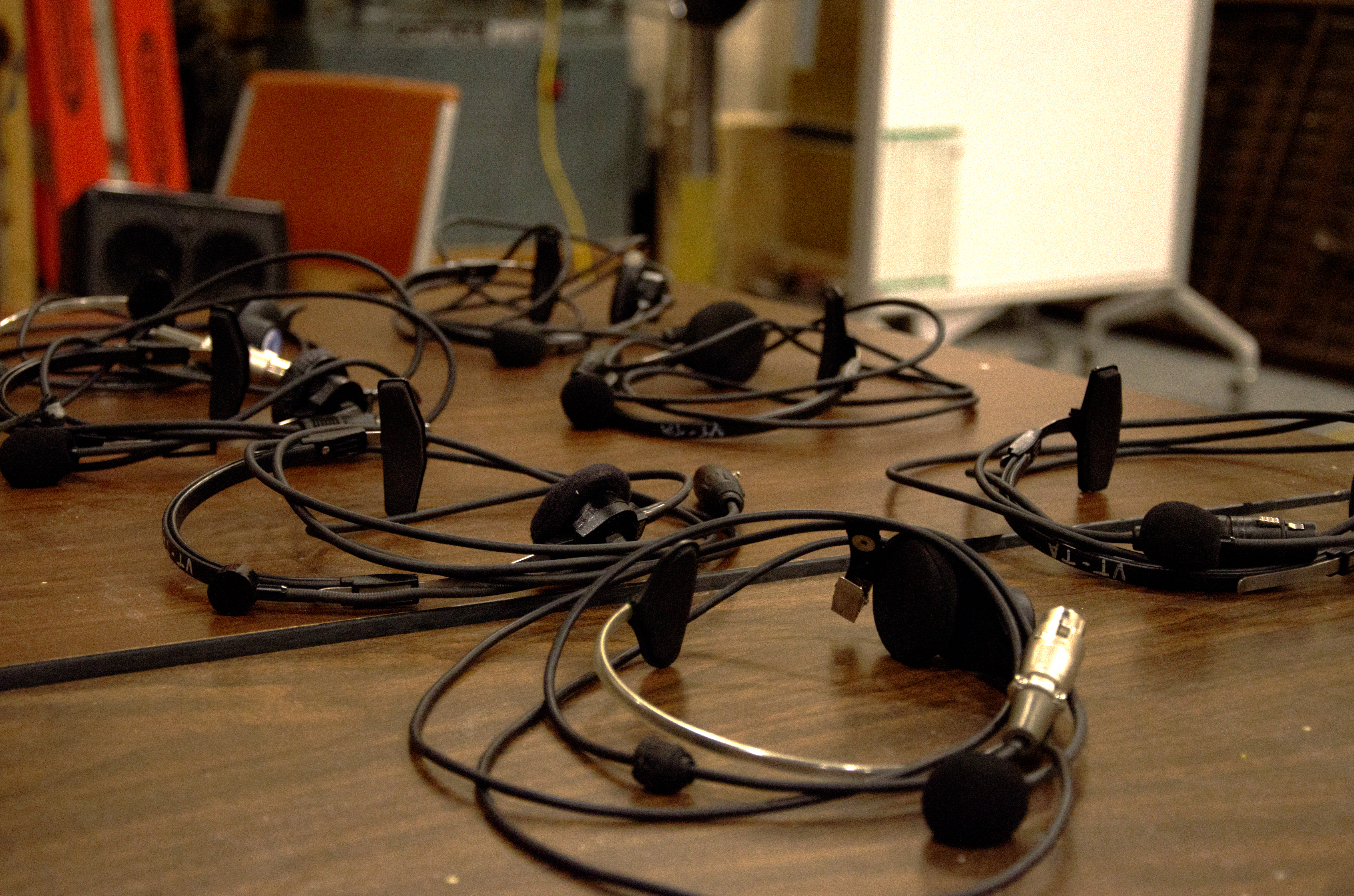Previous Image Next Image headsets Blacksburg, Va., April 19 – Headsets: Communication between technicians, managers and directors is vital for the show to run smoothly. Headsets are used as this line of communication. Photo: Lizzy Street