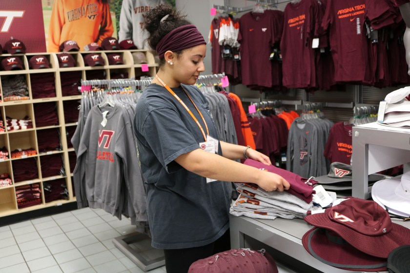 Previous Image Next Image IMG_0176 Blacksburg, Va., March 4 – Folding Clothes: Folding and restocking clothes is also a responsibility for those working an on campus job.