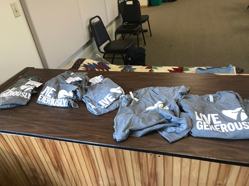 Previous Image Next Image IMG_1646 Christiansburg, Va. – Nov. 9 – Volunteers as well as the homeless are provided with t-shirts that read “Live Generously.” Photo: Taylor Caskey