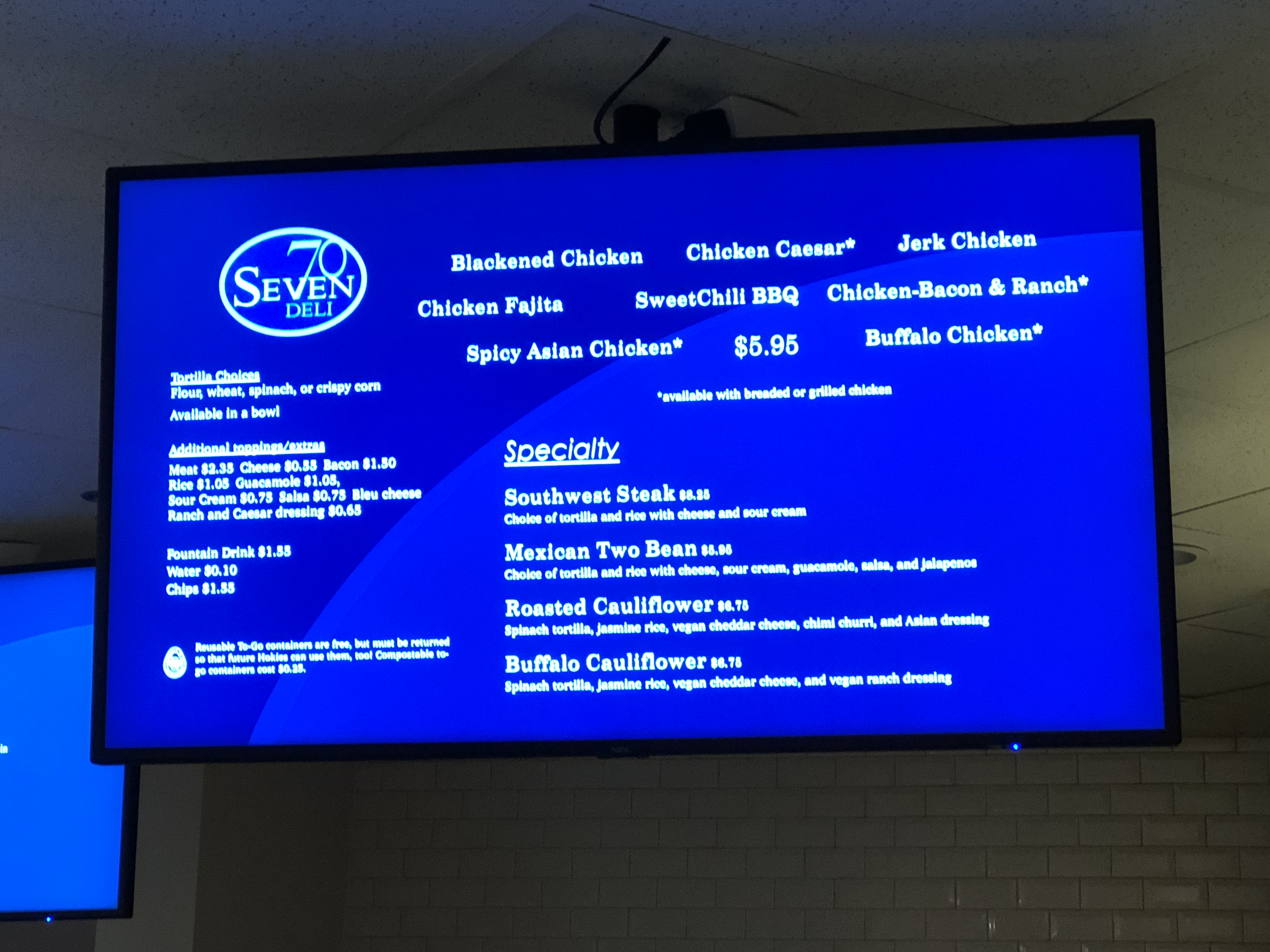 Previous Image Next Image IMG_2046 Blacksburg, Va. Feb.19, 70 Seven Deli’s Menu – On a digital screen one may find all the menu options 70 Seven Deli offers. Along with the buffalo cauliflower wrap, one may also purchase a roasted cauliflower wrap. Photo by: Tatjana Kondraschow