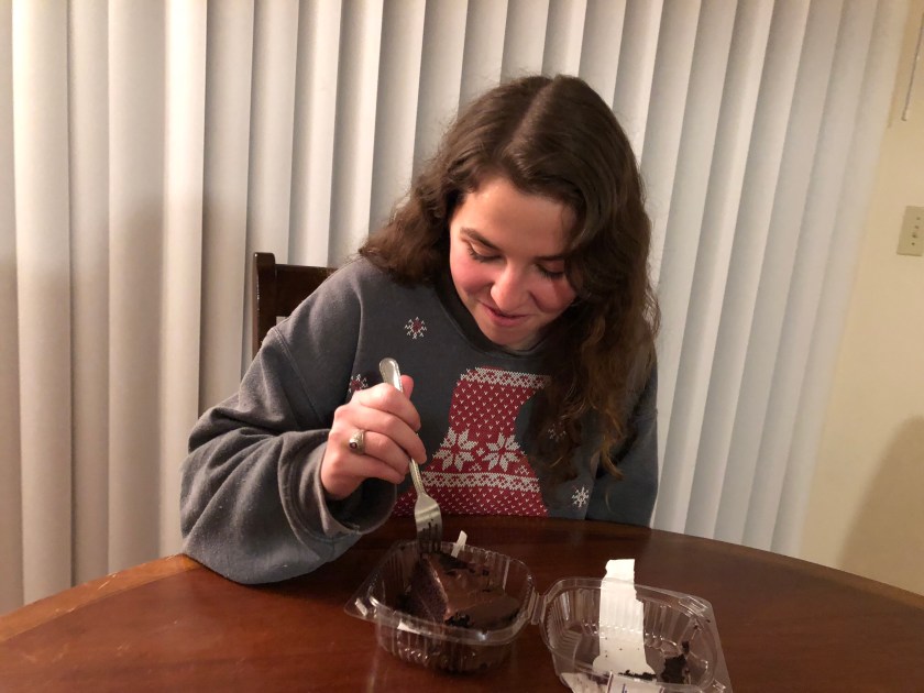 Blacksburg, Va. Feb.19, Reilly Scott enjoying the Vegan Chocolate Cake from West End Market – As a Virginia Tech senior, Reilly Scott enjoys finding new vegan options from the dining halls to maintain her dietary restrictions. Photo by: Tatjana Kondraschow
