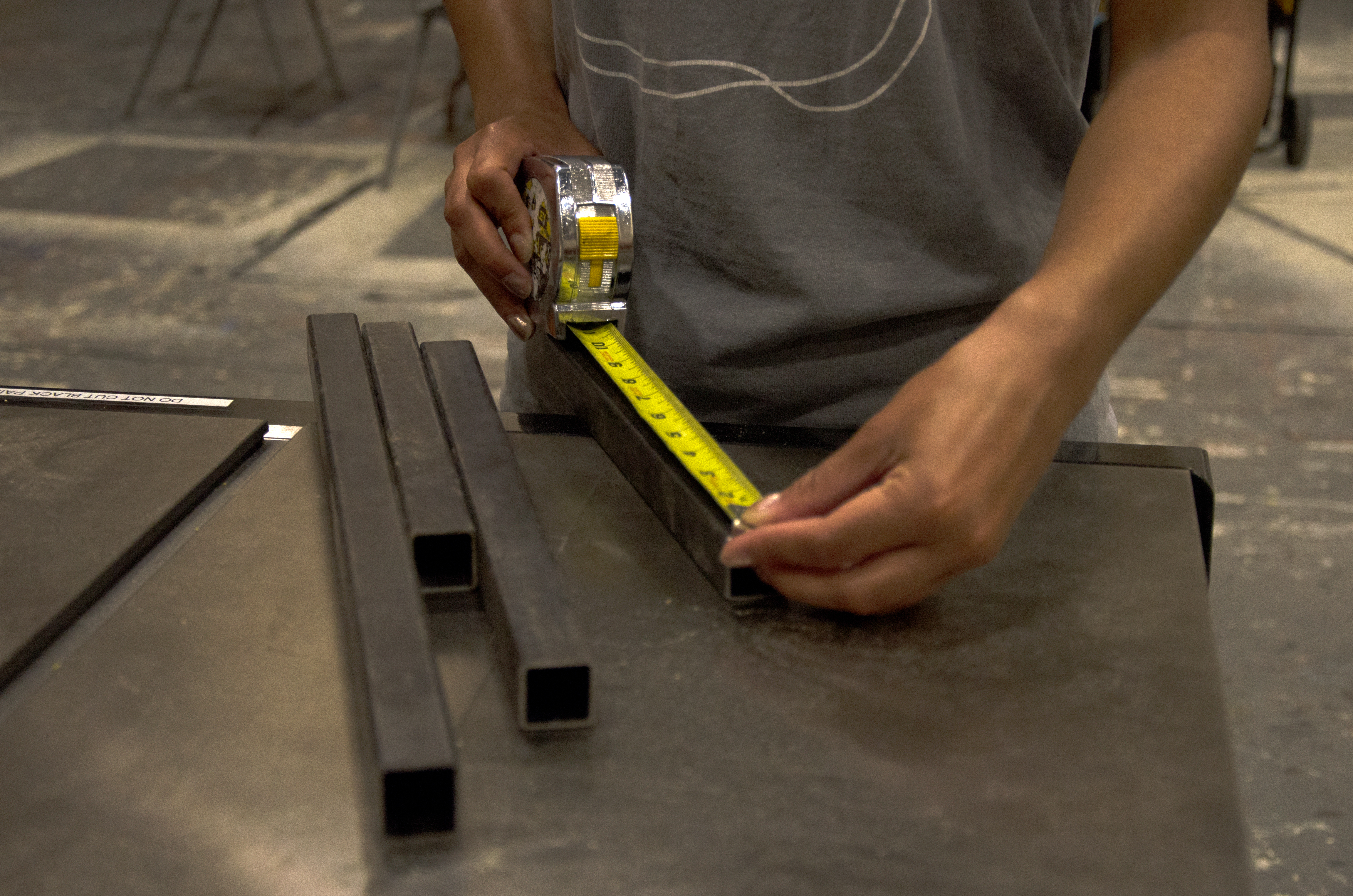 Previous Image Next Image measuring-tape Blacksburg, Va., April 19 – Measuring Metal: Students learn skills for set-building and other projects, including metalworking. Photo: Lizzy Street