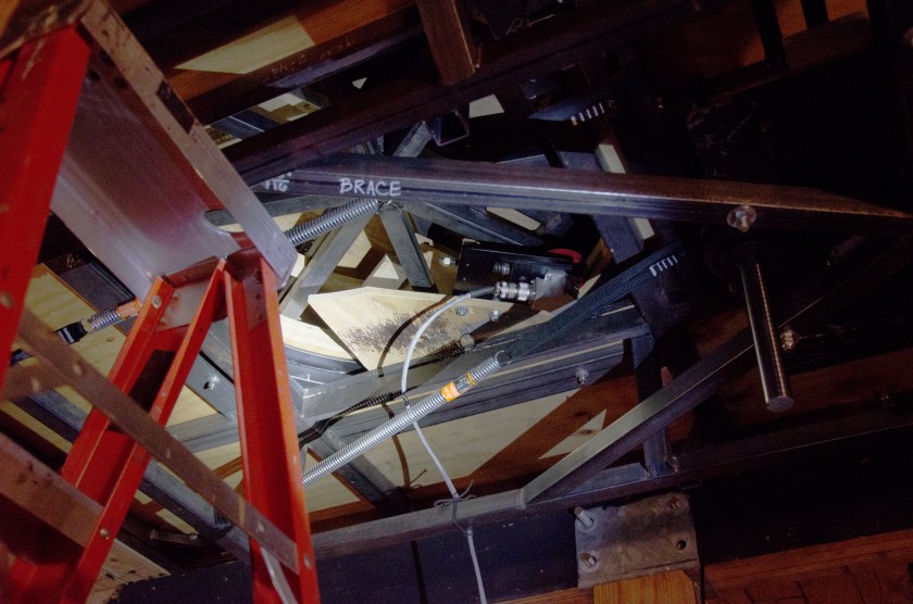 Previous Image Next Image revolving-thing Blacksburg, Va., April 19 – Revolving Set Piece: The piece, constructed by Chris Russo and students, is made from metal bars and is powered by a small motor. Photo: Lizzy Street