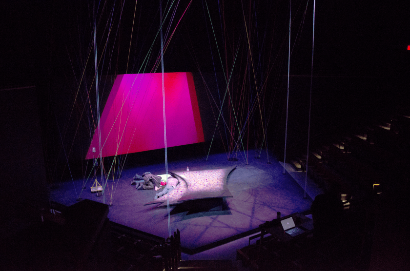 Previous Image Next Image stage-wide-view Blacksburg, Va., April 19 – Doing Repairs: The stage is set for the production. A group of technicians is fixing the revolving set piece in the center of the stage. Photo: Lizzy Street